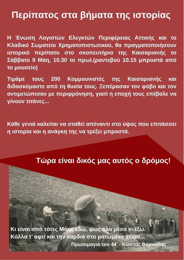 «Κρατάμε ζωντανή τη θυσία τους βαδίζοντας στα βήματα της Ιστορίας». Για τρίτη συνεχόμενη χρονιά η Ένωση Λογιστών Ελεγκτών Περιφέρειας Αττικής, συμμετέχει στον εργατικό – λαϊκό αγώνα δρόμου πουθα διεξαχθεί την Κυριακή 3 Μάη, στο πλαίσιο των εκδηλώσεων Διαβάστε περισσότερα
